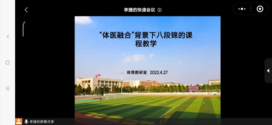 2022年4月27日,体育教研室主任周丹萍组织召开线上教学工作研讨会,主要围绕学习学院最新抗疫工作要求和“体医融合”背景下八段锦的课程教学,体育组全体成员参加会议。